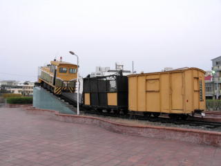 斗南車站の外観。 | 駅前にサトウキビ列車が置いてあった。 機関車の部分が上り坂になっていた。 銀河鉄道999でもイメージしたのか? さ、バスで虎尾に出て、 サトウキビ列車を取材するゾ。 サトウキビ列車の部分は 独立したページにしてありますので こちら からどうぞ。 |