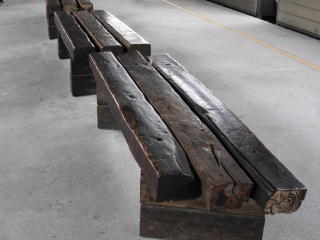 彰化車站のホームにあった 枕木でこしらえたベンチ。 他の駅でも見かけた。 これに座ると枕木に染み込んだ 油が付きそうな不安にかられるが、 もちろんそんなことはない。 |