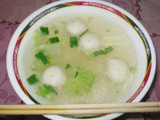 魚丸湯。30圓。 「魚丸」がぷにぷにもちもちと旨い。 店のおかあさんが「どっちも汁物だよ」 といったジェスチャーをしたが、 寒かったので温かい汁物がよかったのだ。 |