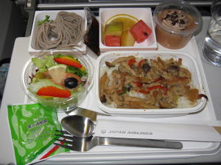 JL098便の機内食。 これはダメ。 伸びきった蕎麦を出すな(前も書いた。)! カットフルーツは切り口がぐずぐず! ムースは蓋すら開けなかった。 |
