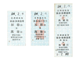 加祿でGETした硬券の一部。 自販機や、窓口に端末がないので 当然硬券を買うことになるが、 日本からわざわざ買いに来る 「好きモノ」が結構いるため、 駅員さんも理解してくれる。 硬券のリストを示してくれるので、 それを見ながら注文する。 実際の運賃額と券面の額がと違う ものもあるが、これは、旧い券に 「運変印」を押さずに発売しているため。 なお、ダッチングの「104」は、 台湾の年号の「中華民国」。 つまり「中華民国104年」ということ。 元年は日本の大正と同じ1912年。 ダッチングマシンの年号部分を 3ケタにしちゃうんだからさすがだね。 ちなみに、昔の台湾の硬券に「86」などと あるのは当然西暦ではないからね。 例えば「86」年なら西暦1997年だよ。 |