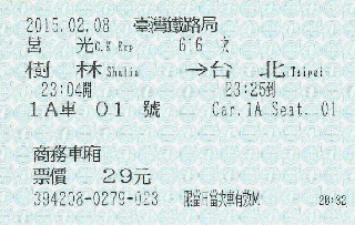 この日は、本来最後部の1車(1号車) の後ろに1A車(1A号車)が 連結されていて、これが「商務車廂 (ビジネスクラス)」だった。 つまりロザ。 事前の情報では掴んでおらず、 台北車站でチケットを買うとき知った。 喜んでこちらに乗ってみることにした。 ※2015/04のダイヤ改正での時刻表には、 「商務車廂」が記されています。 あれ、2015/11にまた確認してみたら、 「商務車廂」の記載がなかったよ。 乗りたい方は最新情報を確認してね。 |