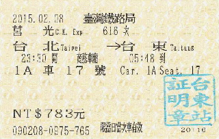 これが「莒光616次」のきっぷ。 樹林~台東の全区間で買おうとしたら 「満席」とのことだったので焦った。 台北~台東なら買えたのだが、 この席は結局樹林~台北も空席だった。 このきっぷが欲しかったので、 台東車站で「台東站証明章」を 押してくれと集札員に頼んだら 「自分で押せ」と言ってくれたので、 メモに練習をしてから落ち着いて押した。 |