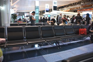| 今回もピーチを使う。 特に早めに羽田空港に来たわけでは ないが、ズラッと空いたベンチがあった。 これなら十分横になれる。 |