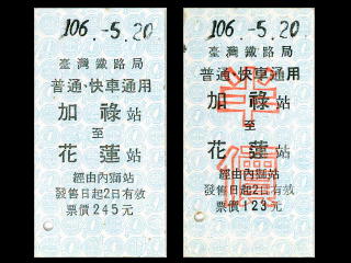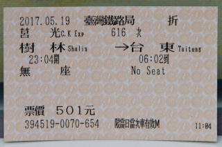 | 定刻の06:02に台東に着いた。 | 割とすぐ連絡する「區間車3514次」。 台東でいったん外に出るのが めんどくさいので、昨日の台北車站の 窓口で、今日の台北~加祿の 乗車券を買っておいた。 |