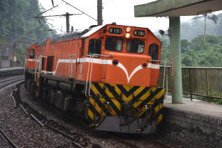 | 福隆に駅弁を買いに行く途中の 雙溪で「普悠瑪432次」の通過待ち。 この駅の手前で、プッシュプルの セメント列車と行き合った。 |