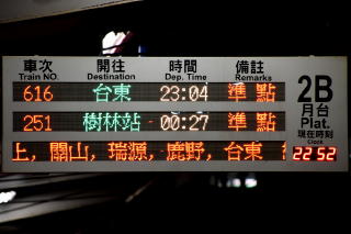 夜行の「莒光616次」の始発の 樹林に来た。 ちなみに、下段の表示は樹林終着の 「自強251次」の到着案内。 |