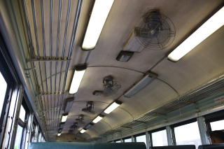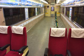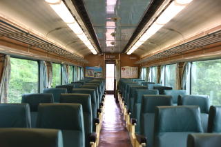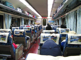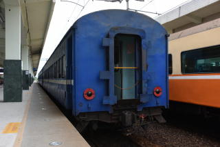 | 俺の乗った1車の車番。 | 車内はガラガラ。 途中で、俺が乗っている1車の冷房が 壊れたので、カレチさんが 他の車両に移るように促したが、 寒い車内に困っていたので 「没問題(=大丈夫)」と伝えたら、 乗降ドアとデッキとの仕切りドアを 開けてくれた。 気持ちのいい風が車内を吹き抜ける。 これって、窓が開かないだけで 旧客とそれほど変わらない気がする。 |