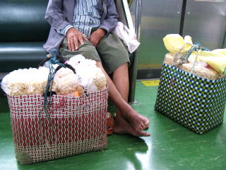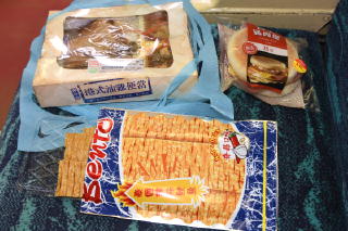 途中から大量の「コメポン」と思われる 菓子を持って乗ってきたおじさん。 てっきり車内で商売するのかと思ったら そうではなかった。 |