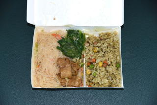 さて、朝メシ。 前の日に、晩メシを喰いに入った 樹林の粗食の自助餐屋で、 持ち帰りも作っておいた。 焼きビーフンと炒飯と その他ちょっとで70圓。 |