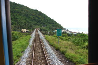 せっかくのハイライトなのに、 雨と風が強まってきた。 バックの海も分からなくなった。 そんな中を走る「普快3671次」。 たいていはオレンジ色のDLなので 客車や海の青、山の緑に映えると 思われるが、今日は青いDLだし、 しかもこの天気で、色は全くダメ…。 動画からのキャプチャー。 |