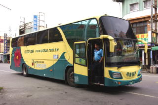 | しばらく待っていると屏東客運の バスが来た。が、片側2車線の センターライン寄りを走っていて、 バス停の直前で俺を見つけて パッシングした。 もちろん俺も手を挙げたので、 運転手は慌てて車線を変えて停車した。 歩道側の車線にクルマが いなかったのでよかったが、 もしいたら車線変更できず、 どうなっていただろうか。 台湾のバスは基本的に手を挙げる ことになっている(バス事業者側が そのように推奨している。)が、 せめてバス停の近くでは、 歩道寄りの車線を走って、 多少の減速をしてほしいと思う。 この写真は、バスが「枋寮站」に 着いたときに撮影。 |
