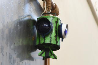 | 待合室にぶら下がっていたオブジェ。 なんでスイカ模様なんだ? |