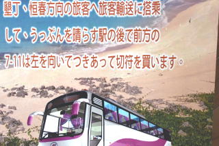 枋寮車站に置いてあった、 観光地である墾丁方面への 乗り換えの案内。 う~ん、相当に無理がある 日本語の文だな~。 イラストのバスは、日本的に 左に乗降口があるゾ。 日本仕様が基になってるか? 案内文は、 「墾丁、恒春へおいでのお客様は、 駅前を進み、セブンイレブンの角を 左折してすぐの「バスタ枋寮」で 切符を買い、バスに乗ってください。」 ってとこだろーなー。 |