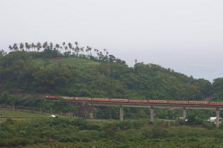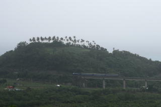 霧雨と風を突いて台東へ向かう 「莒光751次」。 画像をここまで小さくすると感じが 出ないが、海をバックにヤシの木の 山の麓の高架を進む列車は、 いい風景だ。 この画像は動画からのキャプチャー。 上下はほぼ原版どおりで、左右は 320×213ピクセルに収まるように なりゆき的にトリミングしている。 |