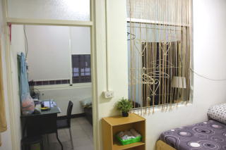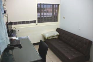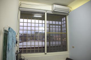 ソファルーム | 窓の向こうにはちょっとだけ 枋寮車站のホームが見える。 エアコンは2部屋にこの1台だけ。 |