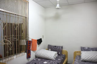 | 寝室の天井に扇風機が付いている。 風呂場でじゃぶじゃぶ洗濯して ベッドライトのコードにかけて干す。 |