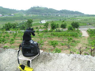 | 列車を降りた頃にほんの少し 当たり始めた雨が、撮影ポイントに たどり着く頃には霧雨になり、 風も出てきた。 坂道を30分もえっちらおっちら歩いて 汗だくになった上に雨に降られ、 なんだかな~、の状態。 しかも風はレンズを向けた海の方向から 吹くので、レンズがすぐ濡れてしまう。 そのため、待機時はタオルをかける。 三脚の代用として、100均でGETした キッチン用の台とビーズクッションを 使ってカメラを固定する。 これがなかなか具合がいい。 外部マイクには、 冬の100均でGETしたぽわぽわの 5本指靴下を被せている。 外部マイクのスポンジカバーだけでは まだ風の音が入るが、この靴下を プラスすればかなり効果が上がる。 |
