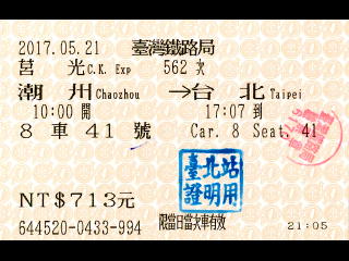 | 台北車站の自販機で、 今晩の「莒光616次」の指定券を 買おうとしたら、想定内だったが 通しでは満席だったので、 ひとまず無座を買った。 |