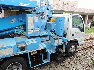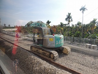 | 線路も走れる日本製の作業車が 置いてあった。 自動車としてのナンバーはないし、 右ハンドルのままなので、 道路を走ることは想定していないと 思われた。 機械の操作説明が張られていたが、 全て日本語のままだった。 |