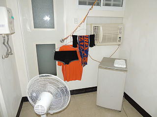| UBでジャブジャブと洗濯して、 扇風機の風を当てながら干す。 洗濯物の左のドアがおもしろい。 外に出るわけではなく、 ちょっとした吹き抜けのスペースが あるだけ。 |