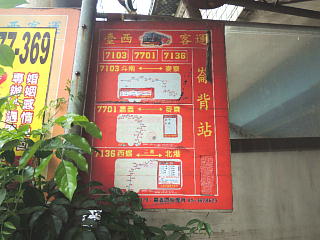 「加祿火車站」站で降りるので、 ちゃんとチャイムを押したのだが、 その1つ先まで運ばれてしまった。 運転手に「加祿火車站」じゃ ね~じゃね~かよ! と文句を言ったら、 バツが悪そうに笑っていた。 運転手もちょっと気にはしていた みたいだった。ったくも~。 |