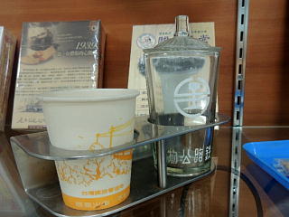 閉塞器の内部。 | お茶セット。 お茶っ葉とお湯を入れるガラス瓶は、 臺鐵の「公物」だったんだって。 つまり、返さないといけいんだね。 コッソリ持って帰ってきた人も きっといただろうね。 グランクラスのタンブラーみたいに…。 |