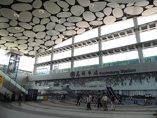 | サクッと高雄に出た。 数か月前に地下化されたばかりだ。 地上のコンコースはきれいに 整備されている。 ちなみに、この小さな写真では 分かりにくいが、 「高雄車站」の文字の下の部分は 壁になっている。 エスカレーターなんかがありそう に見えるけど、壁に描いた絵だよ。 |
