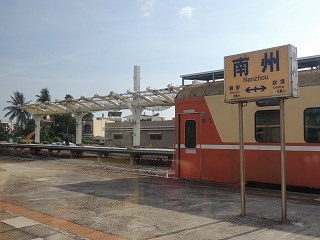 潮州で「區間車3525次」に乗り継いだ。 途中の南州にて。 駅名の字面といい、 実際の風景といい、 南国っぽいね。 電化工事に併せて、 ホームの改修をしていた。 |