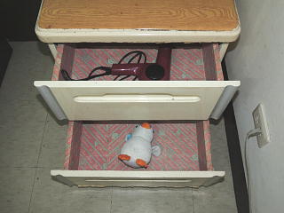引き出しの中。 ドライヤーはともかく、 下段のペンギンはなんだ??? |