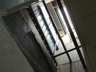 吹き抜けのスペースから 上を見上げる。 覆いがされているので、 雨が降っても濡れることはない。 |