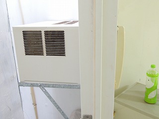 窓用のエアコンが室内に付いている。 「室外機」の部分は、 吹き抜けのスペースに 出っ張っているので、 一応部屋の外といえば外だが、 室内といえなくもない。 なんなんだ…。 写真と文章じゃ説明しづらいので、 気になる人は現地で確認してね(笑)。 |