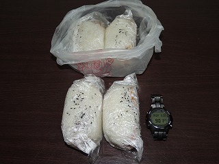 | 宿の近くに小型のトラックの 「おむすび屋」が出ているので 前回に引き続き今回も買った。 昼メシの分と合わせて4つを 拵えてもらった。 腕時計の大きさと比べると いかにデカいかが分かると思う。 1個25圓。 |