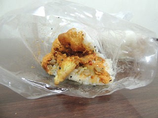 おむすびといっても、 袋にコメを入れて、 具を入れて、 棒状に丸めて、 ぐにゅっと「握る」もの。 具には油條が入っていて、 拵えた直後はカリカリとしていて旨く、 時間が経つとしなっとしてこれまた旨い。 |