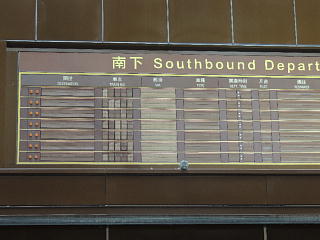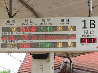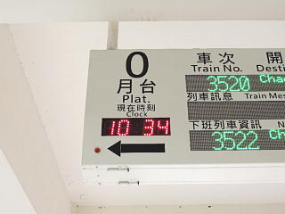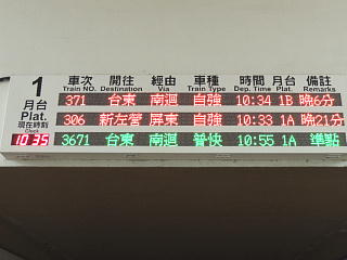 | 今日の目的地の枋寮に着いた。 これまでと同じく、この区間の區間車 は特急車両だった。 右上の発車案内で分かるが、 「0番線」である。 台湾では初めて見た。 |
