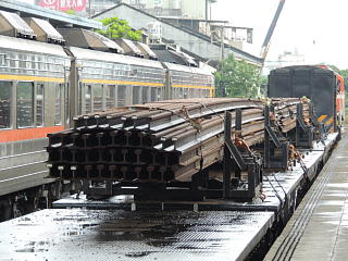 線路を運ぶ貨物列車が来た。 電化用かな。 |