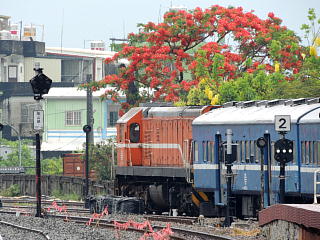 | 「普快3671次」の入線。 これまでは、枋寮の側線に 旧客が留置されていたのだが、 工事の関係でそれができなさそう だったから、どこから入線するのかな と思っていたら、加祿方から 推進されてきた。 |
