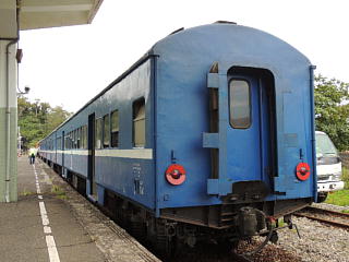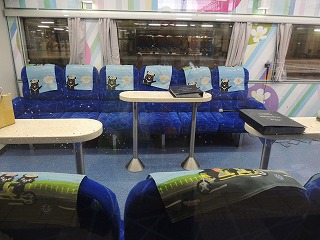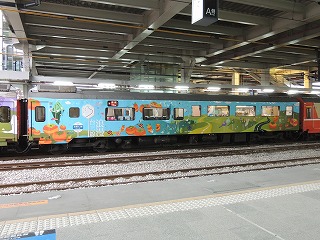この列車は本来はツアー用なので、 「余り席」に潜り込んでいる俺のような 一般客はこのビュッフェには入れない。 カラオケも装備されている。 この写真はホームから。 |