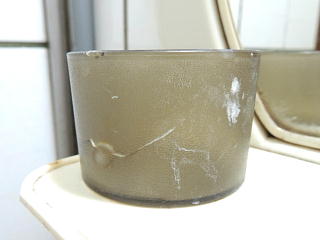 | UBのドレッサーのコップホルダーに 入っていた樹脂製のコップ。 コップの下半分ほどは ホルダーの穴にはまっている。 白い塗料のような物が付いてるし、 ヒビが入っているし、 何よりコップに水が少し溜まっていた。 「ちゃんとした」宿じゃないとダメ な人には耐えられないかもしれないが、 これを使わなければいいだけで、 俺は気にしない。 |