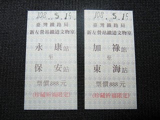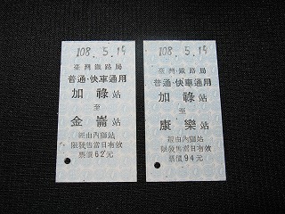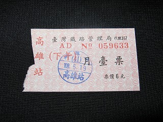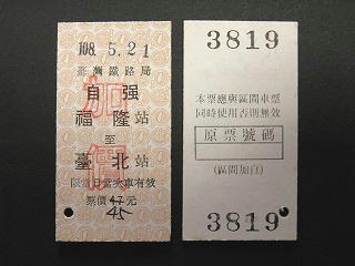 左の券は、俺のコレクション。 たまたま、今回GETした区間と 同じものがあったので、 帰国後に撮影した。 ダッチングが(中華民国)86年なので 1997(平成9)年の券だ。 票價が当時より安くなってる…。 |