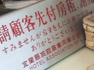 宿のフロントに「料金先払い」の案内 の三角板があったので、 コッソリ撮影した(宿の人は ロビーのソファで寝てた(笑)。)。 「お拂ひ下さい」が泣かせるねぃ。 漢字と平仮名でフォントが違うし。 |