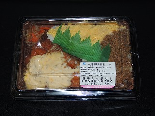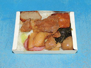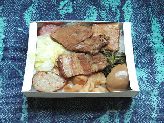 中身を見て驚いた。 さっきの便當と全く同じといって いいほどソックリだった。 同じ便當屋がやってるんじゃないか と思うほどだった(笑)。 |