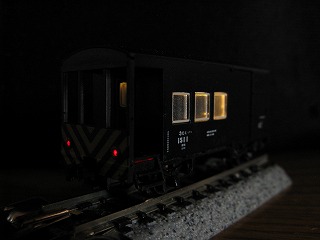 荷物室の付いた有蓋緩急車。 「3CK1500」。 昔は日本でも見たね~。 本来はテールライトだけが 装備されているが、 そこに無理矢理KATOの 電球色の室内灯を組み込んだ。 ヒマでしょ(笑)。 |