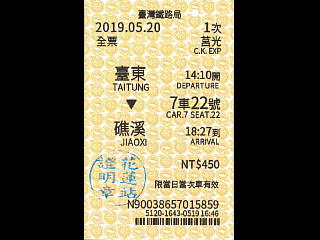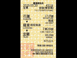 一部区間が無座の、 「普悠瑪431次」のきっぷ。 普悠瑪號は無座での乗車は 基本的にできないが、 乗車日限定で発売してくれる。 このきっぷを買ったとき、 「一部が無座でもまあいいや」 と思ったのだが、よく確認したら、 ほぼ1時間の乗車中、 50分以上が無座で、ほんの数分の 羅東~宜蘭だけが對號座…。 結局、全区間デッキにいた(苦笑)。 |