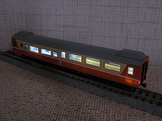 これも前から欲しかったビュッフェ車。 「35DC10500」。 テールライトは元々装備されており、 そこへ室内灯を組み込んだ。 組み込みは日本の車輛よりも 遙かに簡単だ。 室内の部品にも塗装がされていて、 リアル感が増している。 テールライトの光が車輛の側面から 漏れているのはご愛敬。 ま、直すなら、車輛の内側に アルミテープでも貼ればいいが、 ひとまずこのまま。 |