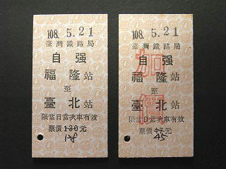 福隆では、なんと特急自強號の券 を復活発売している。 2年前の2017/05に南平で 急行莒光號の券を買って以来の 優等列車の券GETである。 南平の券は俺が買った約半年後に 完売してしまったが、こちらは ずっと発売し続けてほしい。 |