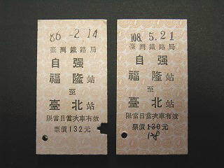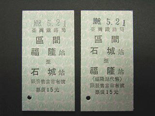 福隆では、自強號の券の他に 區間車の券も数種類発売している。 そのうち、隣の石城への券は、 通常の片道券の他に、 石城からの片道券も「代售」で 発売している。 この2枚合わせて「往復きっぷ」 というイメージか。 |